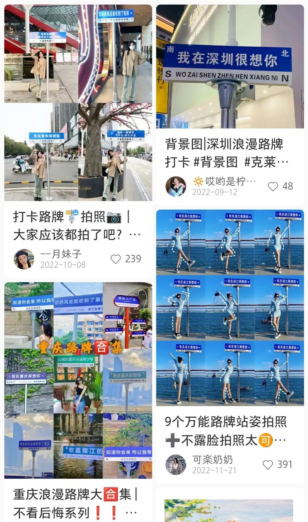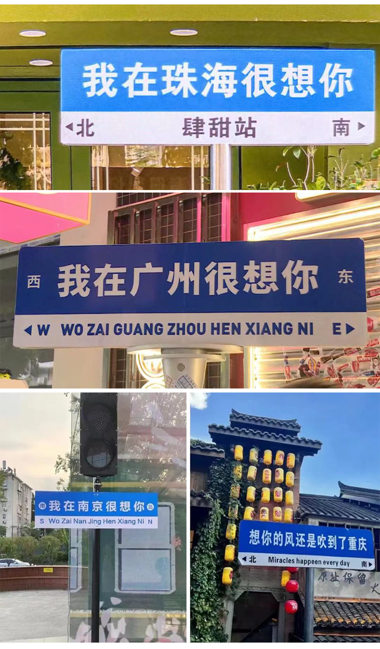 不知从何时开始,各大城市刮起一股城市宣传风,几乎每个城市都有一块“我在___很想你”的网红路牌。这种统一的蓝底白字,统一标注上东西朝向的路牌还陆续出现在多个景区打卡点。01