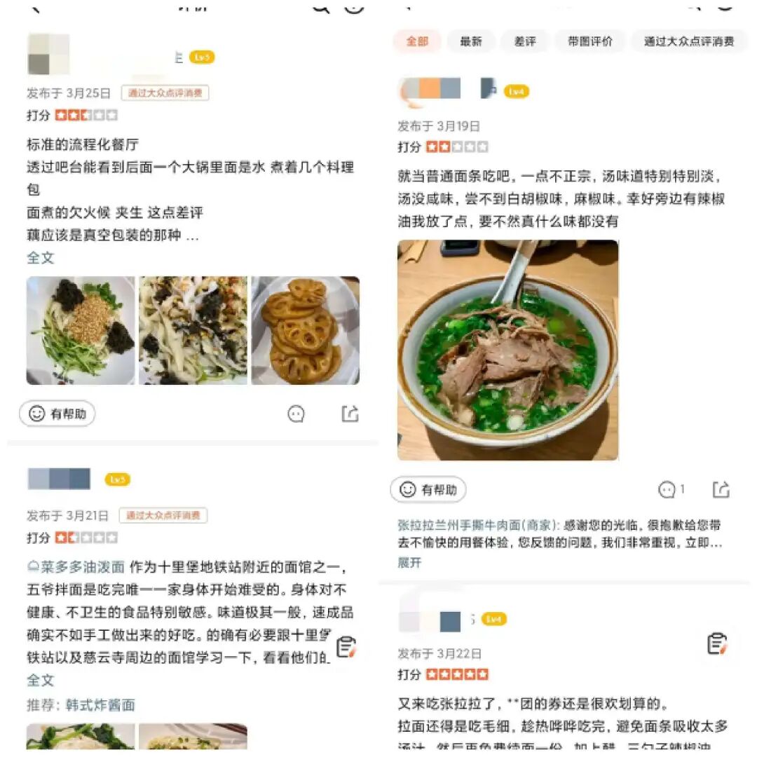 燃次元在大众点评看到,五爷拌面的评论区有大量用户吐槽“面难吃”;和府捞面评论区中出现较多的则是“性价比低”和“工业味道”;同样在张拉拉和陈香贵的评论区,也充斥着大量“面不正宗”和“服务差”的评价。