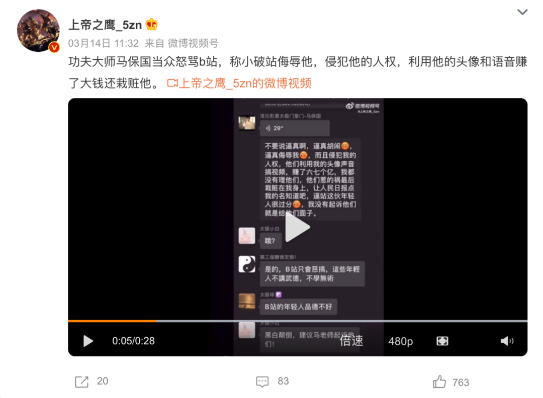 在被官媒点名、B站封禁账号后,曾有一段疑似马保国在粉丝群里的录音流传出来,是马保国痛斥B站,“B站侮辱我,侵犯我的人权,他们利用我的头像生意搞视频”“B站这伙年轻人很过分,我没有起诉他,就是给他们面子。”