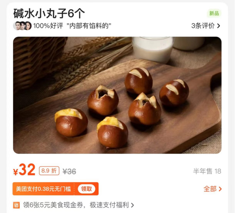 以北京为例,在某外卖App上搜索“碱水面包”或“贝果”后可以发现,这些还不如巴掌大的面包,售价基本为15-20元一个。尽管一些商家会强调低发酵的产品口感扎实饱腹感强,但如此迷你的面包对于青壮年确实有点热量不足。