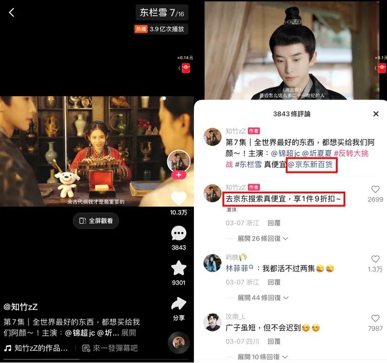 近期,快手站内播放量TOP的短剧《东栏雪》,也和京东新百货达成了番外和直播的合作。这显然是一个不错的成绩,在《东栏雪》的评论区,更有不少用户高呼“现在短剧质量都这么高的吗?”“感谢京东新百货替我们发糖。”