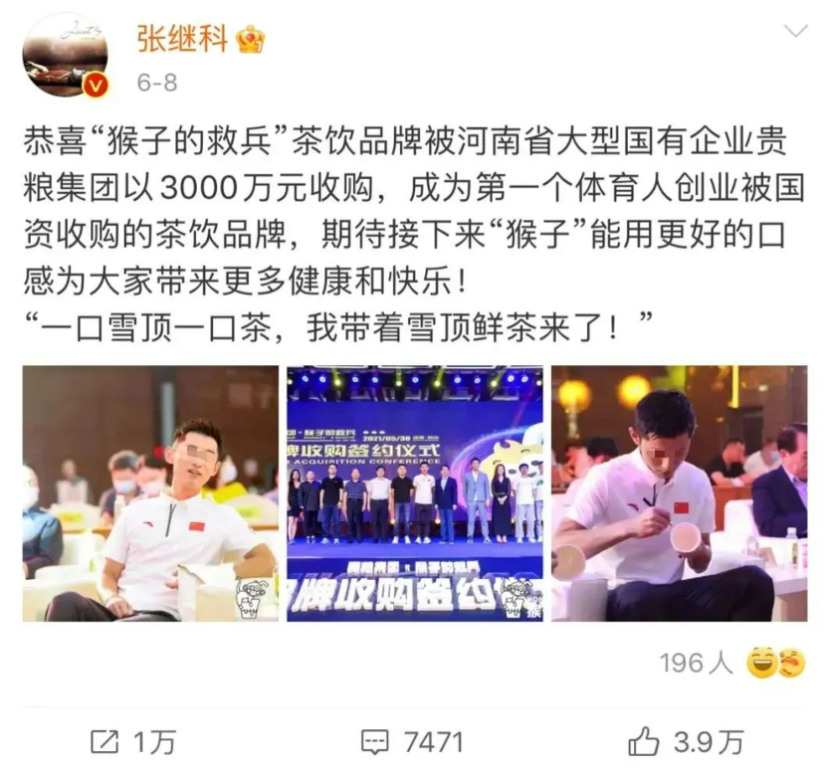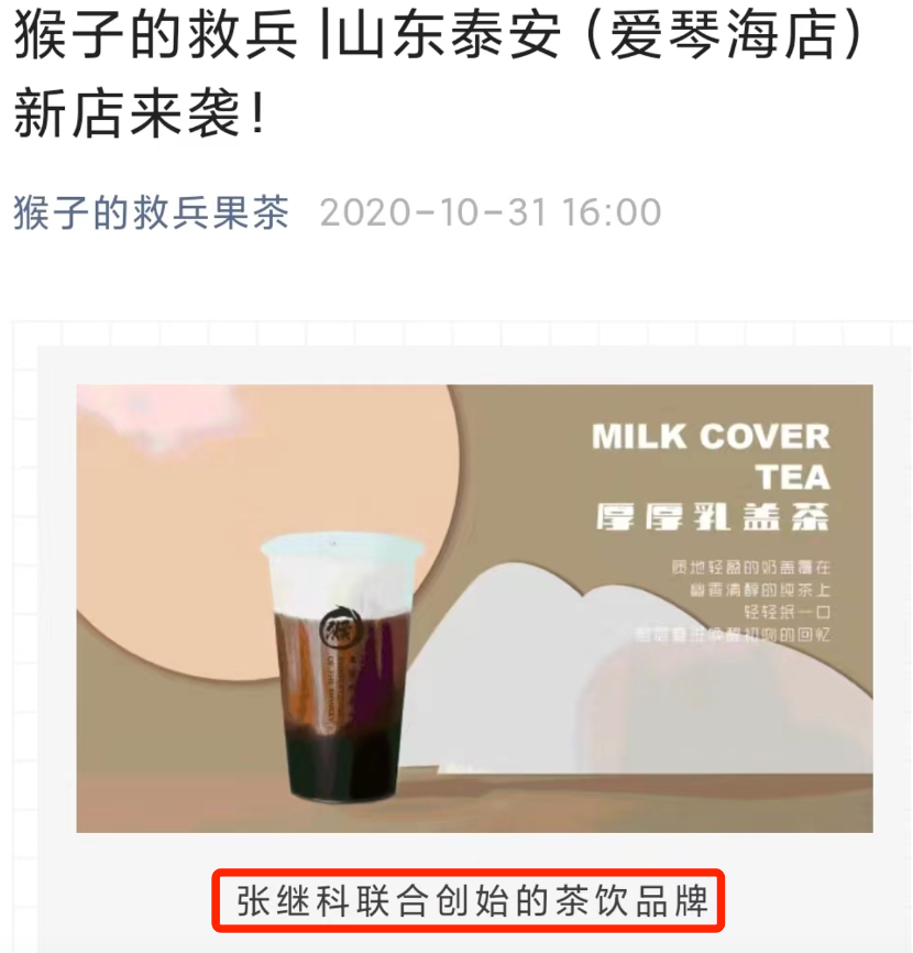 哪怕在“猴子的救兵”官方微信公众号上,明确写着“张继科联合创始的茶饮品牌”;哪怕张继科曾亲自发微博,称“猴子的救兵”成为第一个体育人创业被国资收购的茶饮品牌。