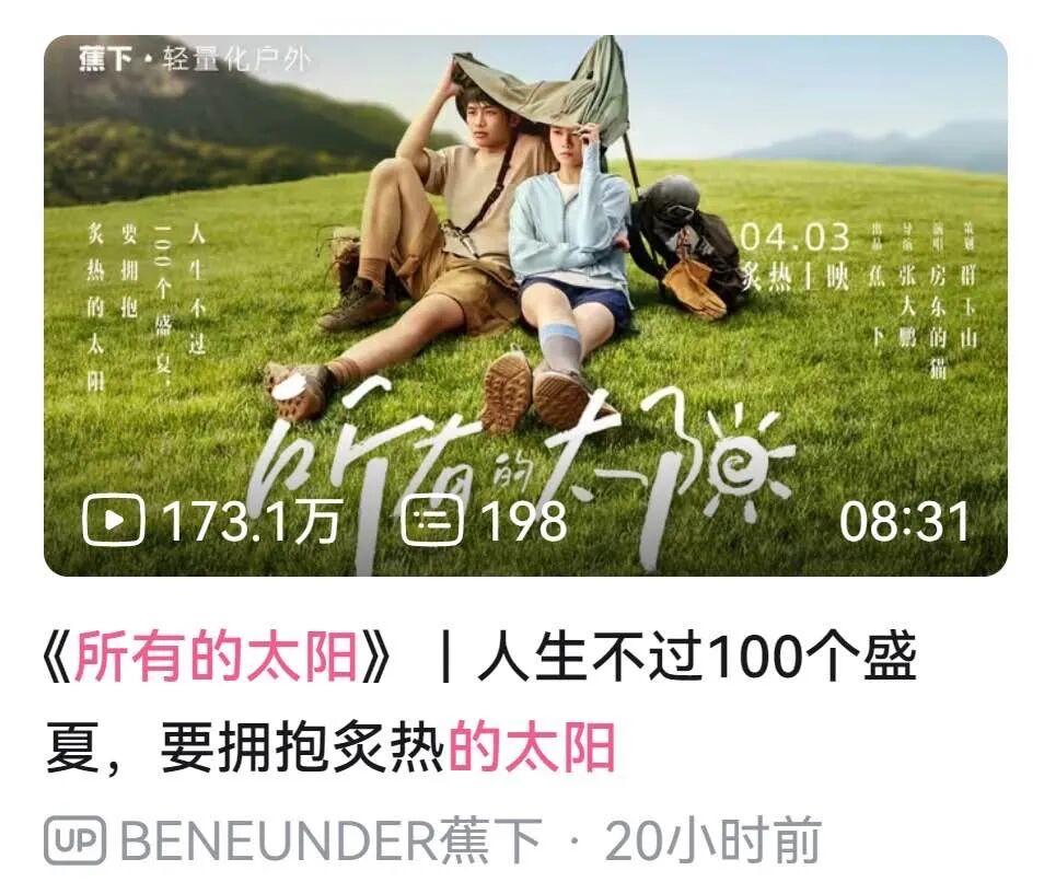 一切可能的相遇,都需要我们走出这一步,走出家门,打开心门。“人生不过100个盛夏,要拥抱炙热的太阳”,《所有的太阳》之所以能引发破圈传播,既说明品牌所倡导的轻量化户外生活方式,是大多数年轻人的向往,也说明正能量的品牌理念,切中了当下的社会情绪,引起了消费群体的广泛共鸣。