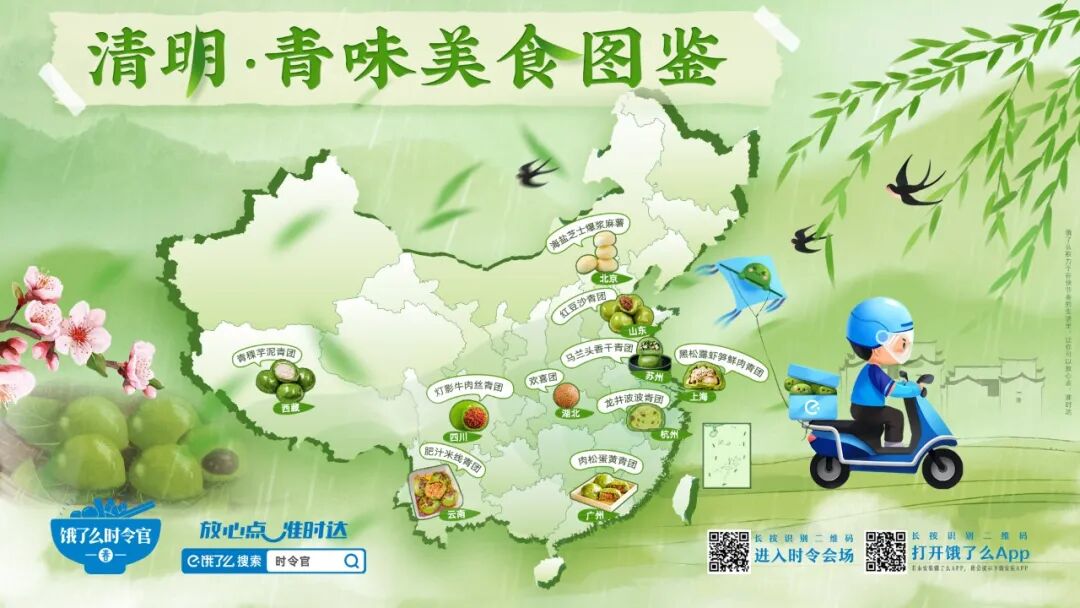 “限定”“尝鲜”是时令营销的关键词,因此,敏锐感知市场热点趋势,精准把握时令节气内核,并快速做出反应是关键。基于对用户需求的洞察和经验沉淀,饿了么结合清明礼俗、踏青场景,抽丝剥茧后,最终落在“清明雨纷纷,百搭青味生”主题上,并以近年网络爆火且口味不断出新的青团作为切入点,带出清明特色美食和饿了么“放心点”心智,借助时令热点流量,引发传播连锁反应。