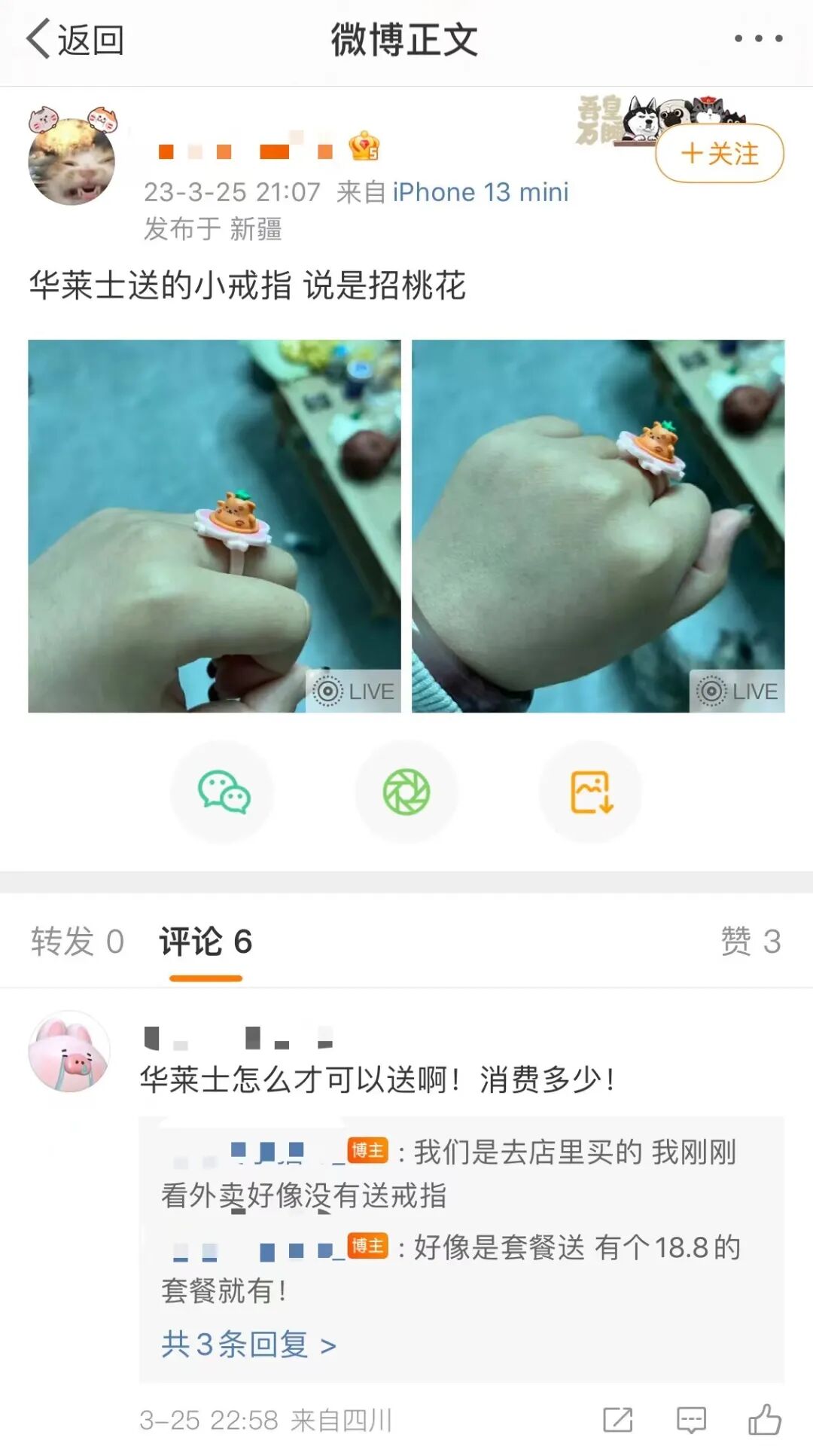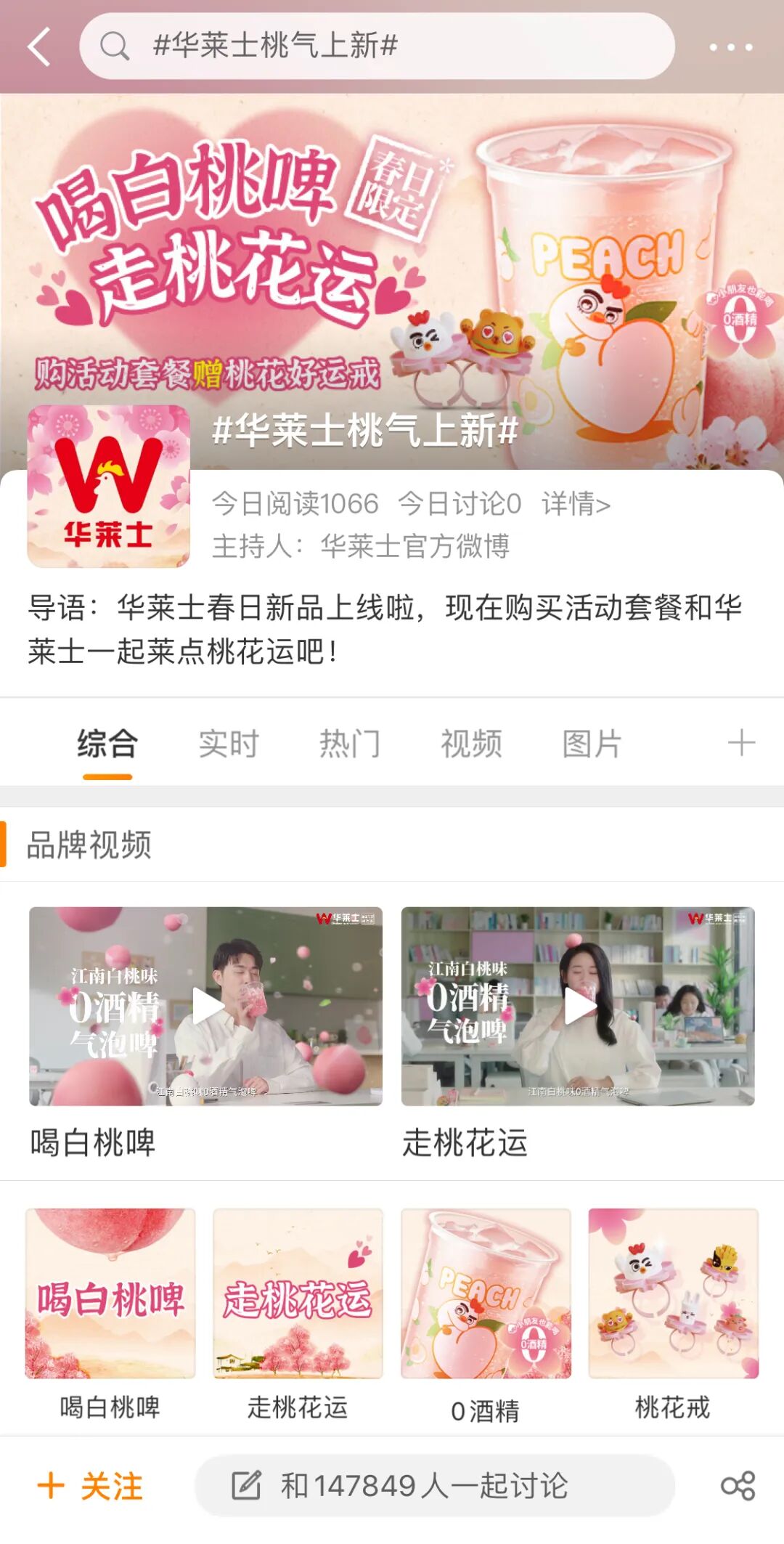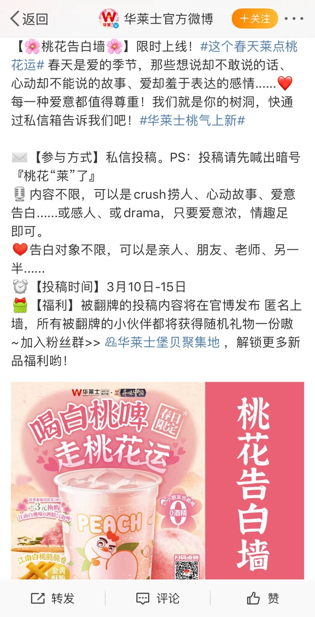 这些用户提到的“桃花签”“桃花戒”均是华莱士春日限定新品白桃啤的周边,华莱士能跟年轻人的“桃花运”扯上关系也是因为此次新品在微博的营销。