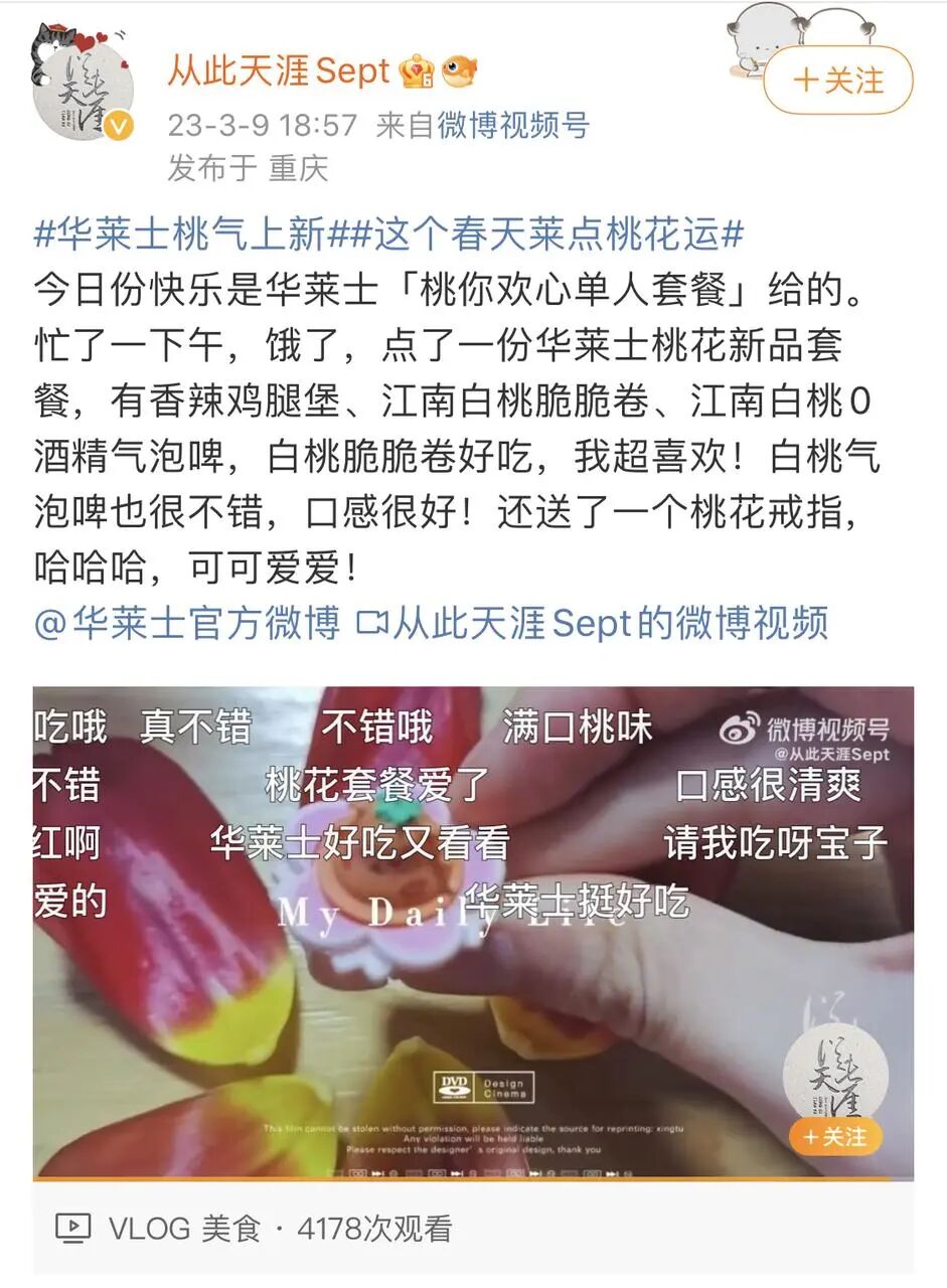 从数据上来看,营销话题#华莱士桃气上新#和互动话题#这个春天莱点桃花运#总阅读量超过4.7亿,讨论量高达23万;从心智影响上来看,已经有不少消费者将华莱士和“脱单”“桃花”等关键词形成了捆绑,在微博上纷纷晒单。