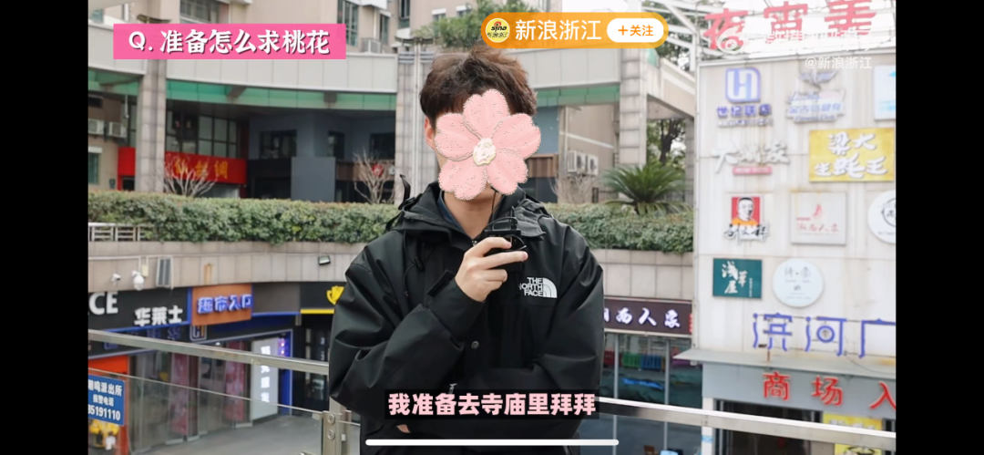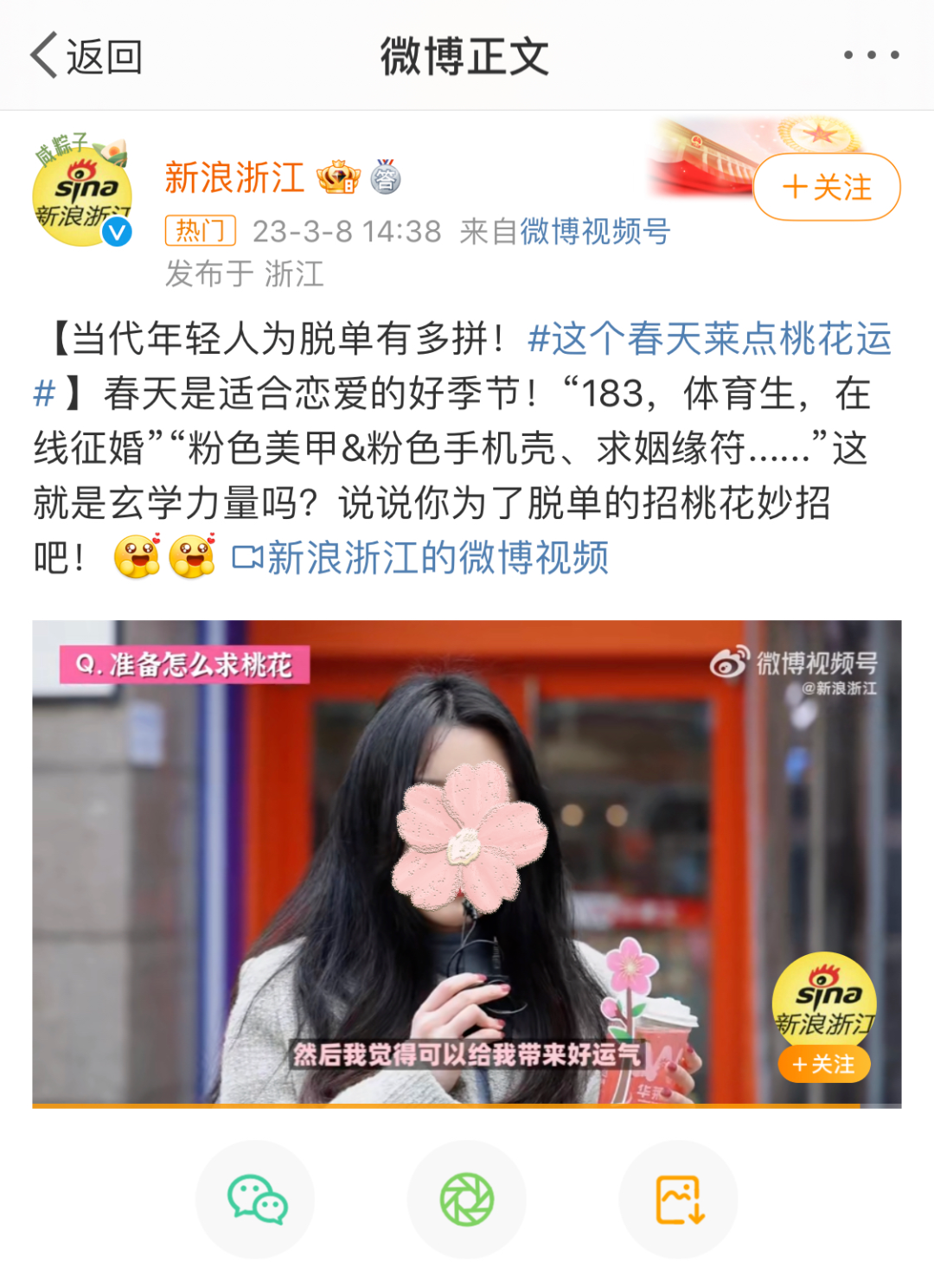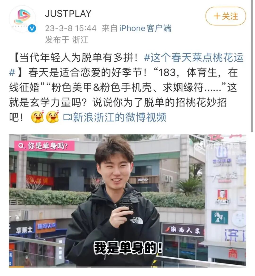 同时发起话题#这个春天莱点桃花运#,用开头的街采视频带动话题传播。@新浪浙江 @JUSTPLAY @微博蓝朋友 @微博品牌号 等蓝V联动助推视频破圈,引导用户畅聊招桃花大法,正式开启玄学营销。