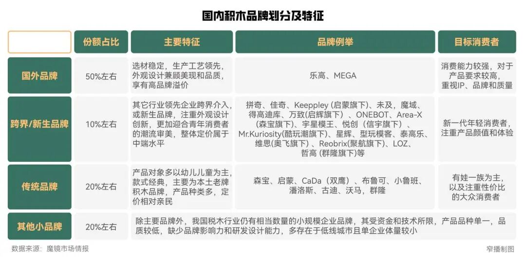 以1993年乐高在国内开展玩具分销业务为标志,中国积木市场开始成型。但早在上个世纪70年代末期,如广东汕头的澄海就开始承接玩具来料加工,积累下了成熟的人才和供应链体系。最近两年,国产积木品牌在中国市场奋起直追。其中,不乏如启蒙、森宝等从代工厂转型而来的「老字号」,还有如布鲁可这样有儿童教育领域背景和巧合这样主打中国传统文化的新入局者。