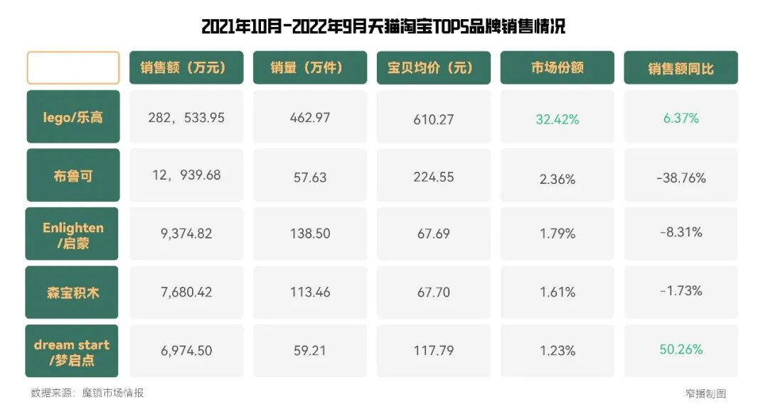 但这依然是个极其分散的市场。魔镜市场情报对2021年10月-2022年9月天猫淘宝的积木销售统计显示,乐高的市场份额基本在32%-33%左右,而整体市场CR5(业务规模前五名的公司所占的市场份额)基本在35%-55%上下浮动,也就是说乐高基本贡献了CR5的80%;除了乐高之外,其他四家全为国产积木品牌,之间市场份额差距非常小。