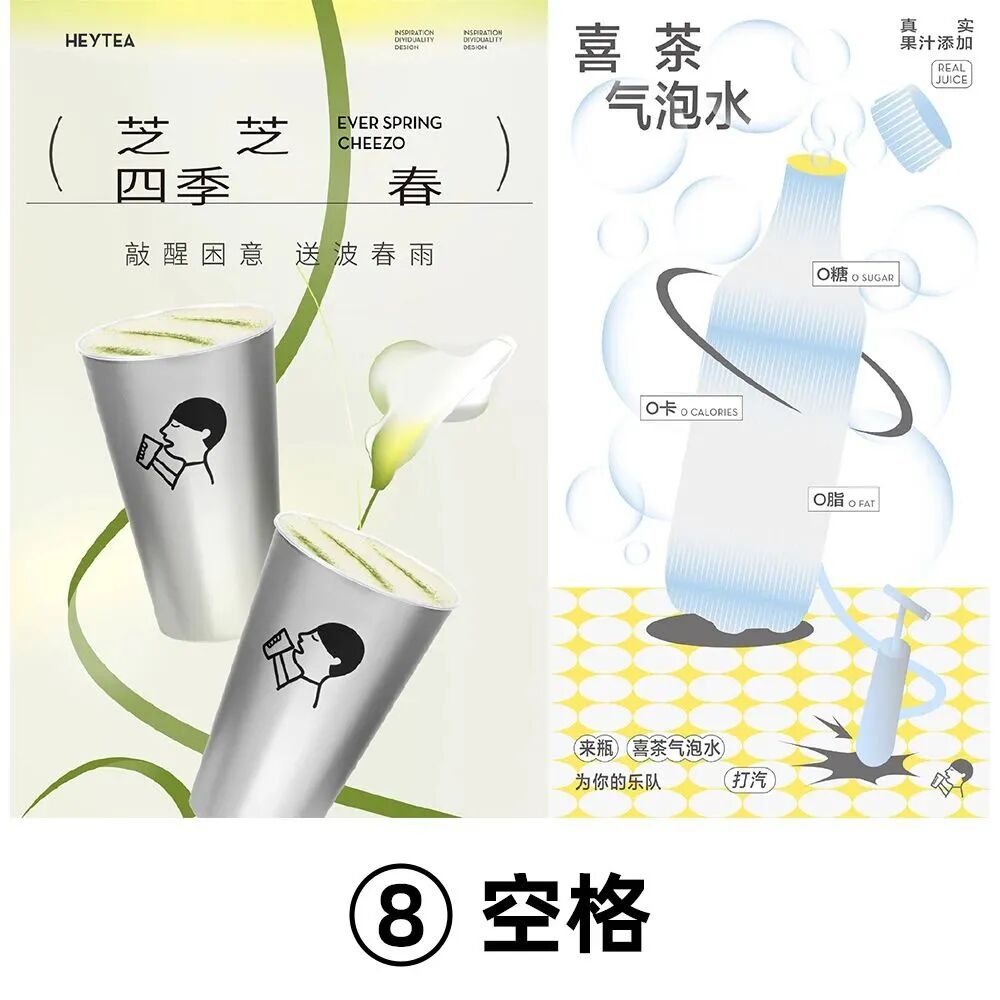 喜茶的海报很喜欢使用一些标点符号,比如括号、句号、引号、冒号等,这些符号的加入可以增加标题中的图形元素,也能与文字形成造型上的对比,使视觉更加活泼、丰富。