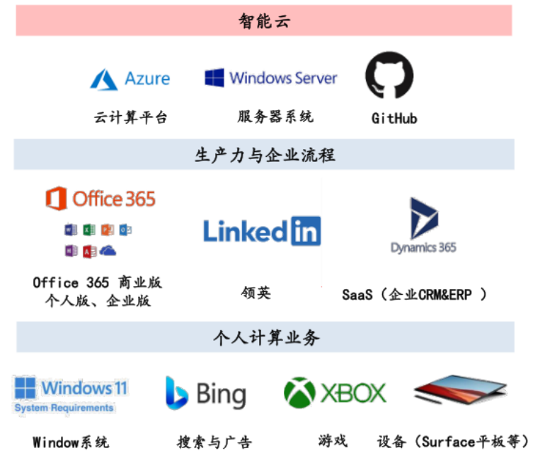 目前微软的业务分为三大板块:生产力与企业流程(Office、LinkedIn等);个人计算业务(Windows、Bing、游戏、平板等)和智能云(云计算平台、服务器系统等)。其中,智能云是近些年微软投入最多、发展最快的业务部门。