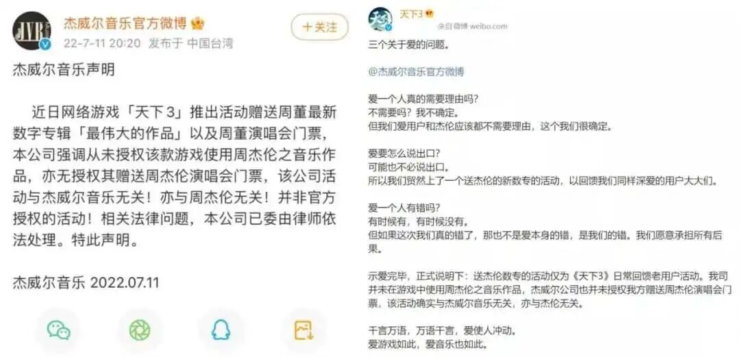 双方纠纷的源头,可以溯源到2022年7月。彼时,周杰伦专辑《最伟大的作品》发行首播,引发全网广泛关注。而同年7月6日,网易雷火出品的游戏《天下3》在微博发布了“转抽送100张周杰伦新专”的活动。
