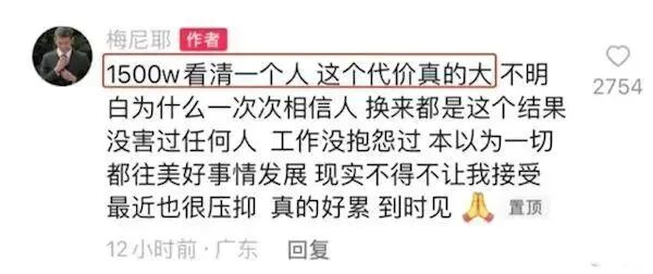 首先是游良文化旗下的最大网红、粉丝数3100万的梅尼耶,在抖音置顶了一条评论,透露自己被公司创始人骗了1500万。之后在直播时,他又表示,线上线下加起来,被骗总金额可能接近4000万。