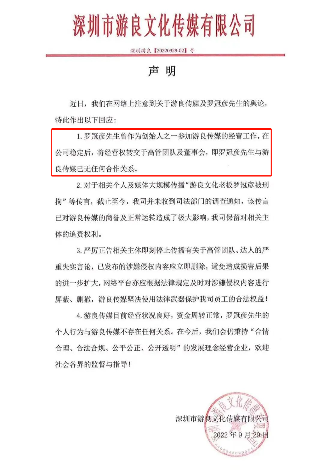 而真正将舆论传闻盖棺定论的,还属游良文化的一纸声明,承认罗冠彦以前是公司创始人,但现在双方已经没有任何合作关系。