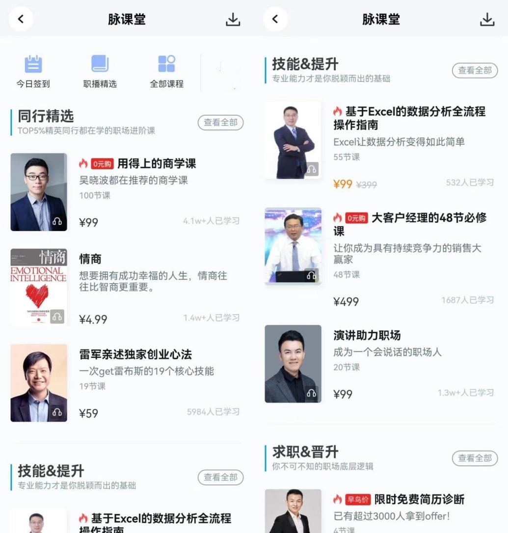 “脉课堂”则针对求职晋升、技能提升、管理成长等不同需求,上线66元到499元不等的培训课程。首页上销量最好的是标价99元的“用得上的商学课”,有4.1万人学习。标价4.99元的“情商”,则有1.4万人学习。二者相加,5万余人的学习数据,显然很难为脉脉带来可观的收益。
