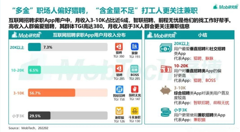 如果从用户角度来看,脉脉和猎聘的用户确实有一定重合。以月收入为例,据Mob研究院发布的《2022年互联网招聘求职行业洞察报告》显示,月薪2万元以上的求职者更喜爱使用猎聘和脉脉。
