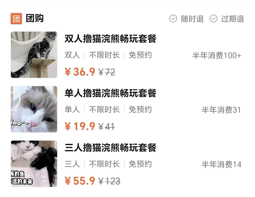 因为复购率不高,客流量低,大部分猫咖都会选择高客单价模式。以刺猬公社编辑部为原点,方圆5公里内,有近10家猫咖馆,不限时的单人团购门票普遍在100元以上,部分店家为降低客单价,会提供1小时或30分钟的“撸猫套餐”,价格在40到80元不等。