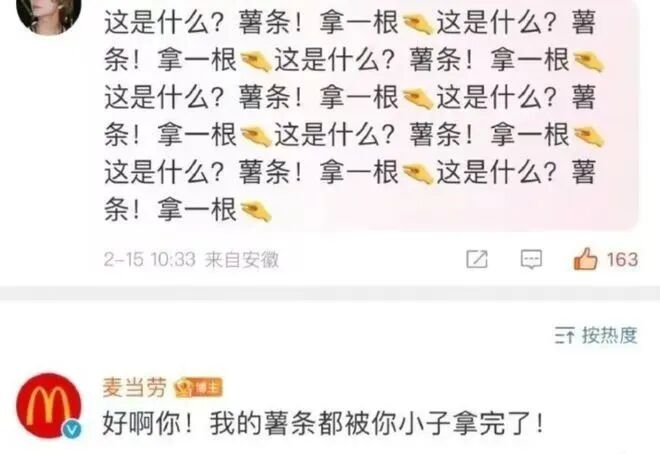 麦当劳突然化身海鸥,光明正大在微博上偷薯条,并嫌弃粉丝抓得太多: