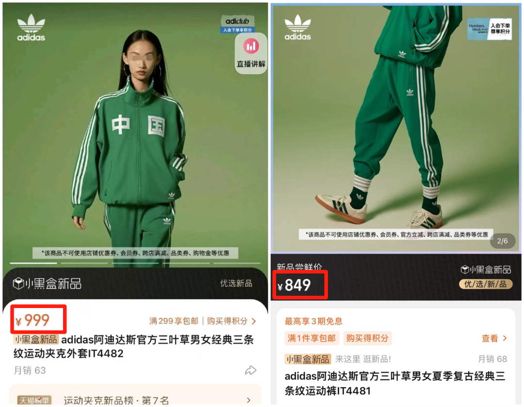 再看阿迪达斯这款运动服,设计上大差不离,价格上却天差地别。