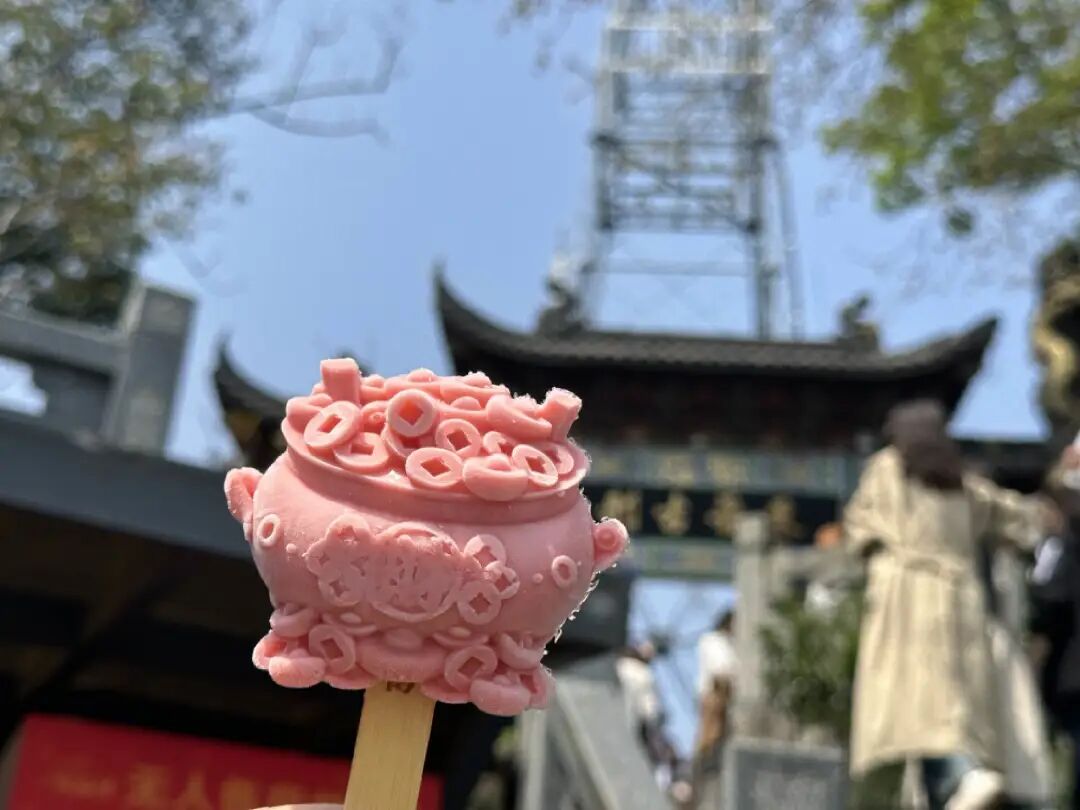 “其中一站是杭州天下第一财神庙,除了诚心求财,我还买了一支财神庙的文创雪糕,雪糕上的铜钱非常应景,粉色雪糕拍照也很出片。我已经习惯这种打卡形式,总想着有些景点不一定会去第二次,既能拍张好看的照片留作纪念,又能吃口甜甜的雪糕,这种体验挺好的。”