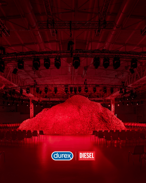 它俩此次的联名,还走上了2023秋冬米兰时装秀场,用20个万Diesel×杜蕾斯联名套套搭了个服装走秀舞台。