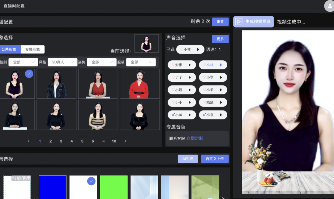 根据一位个人卖家提供的公模网址,这里面有上百个主播形象,用户可以自由挑选形象、声音、背景,输入文本,点击界面上的一键生成,便能看到一个时长五分钟的数字人视频预览,如果觉得合适,用户便可以买下公模的使用权,投入到直播间使用。