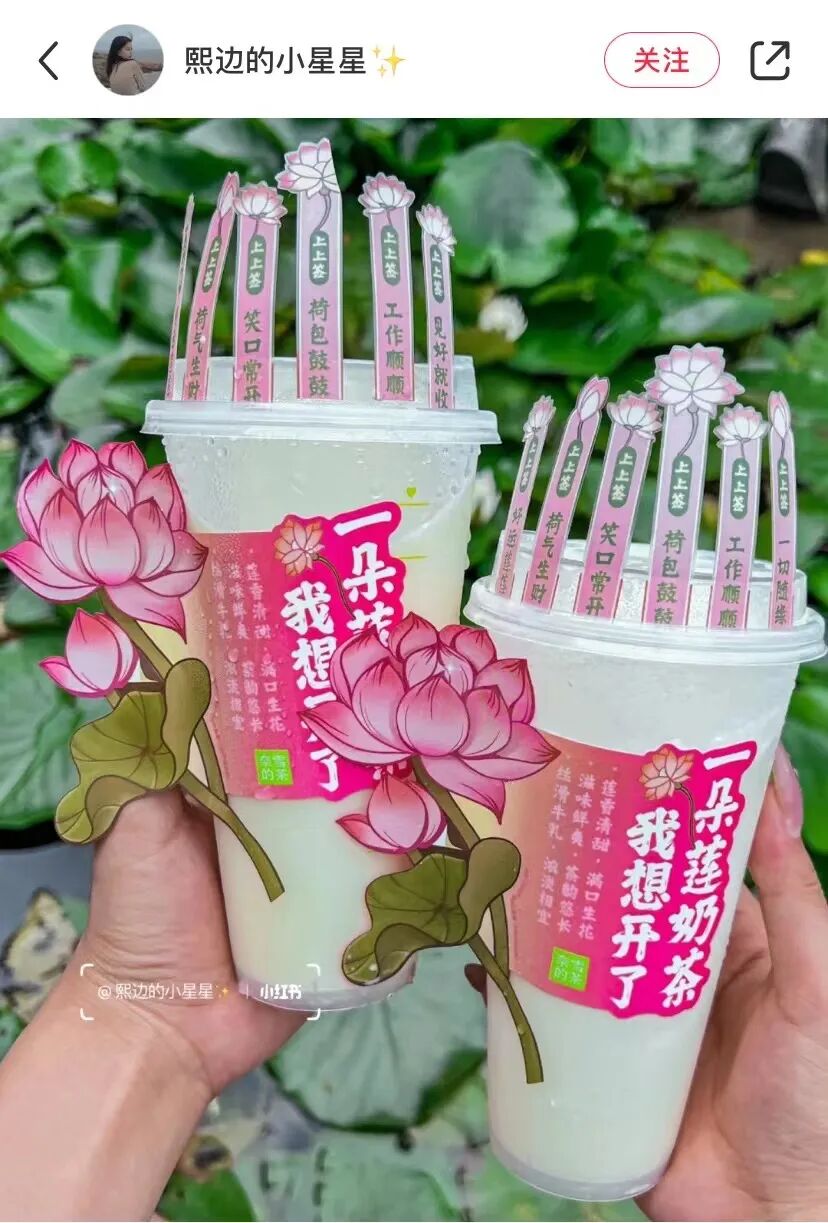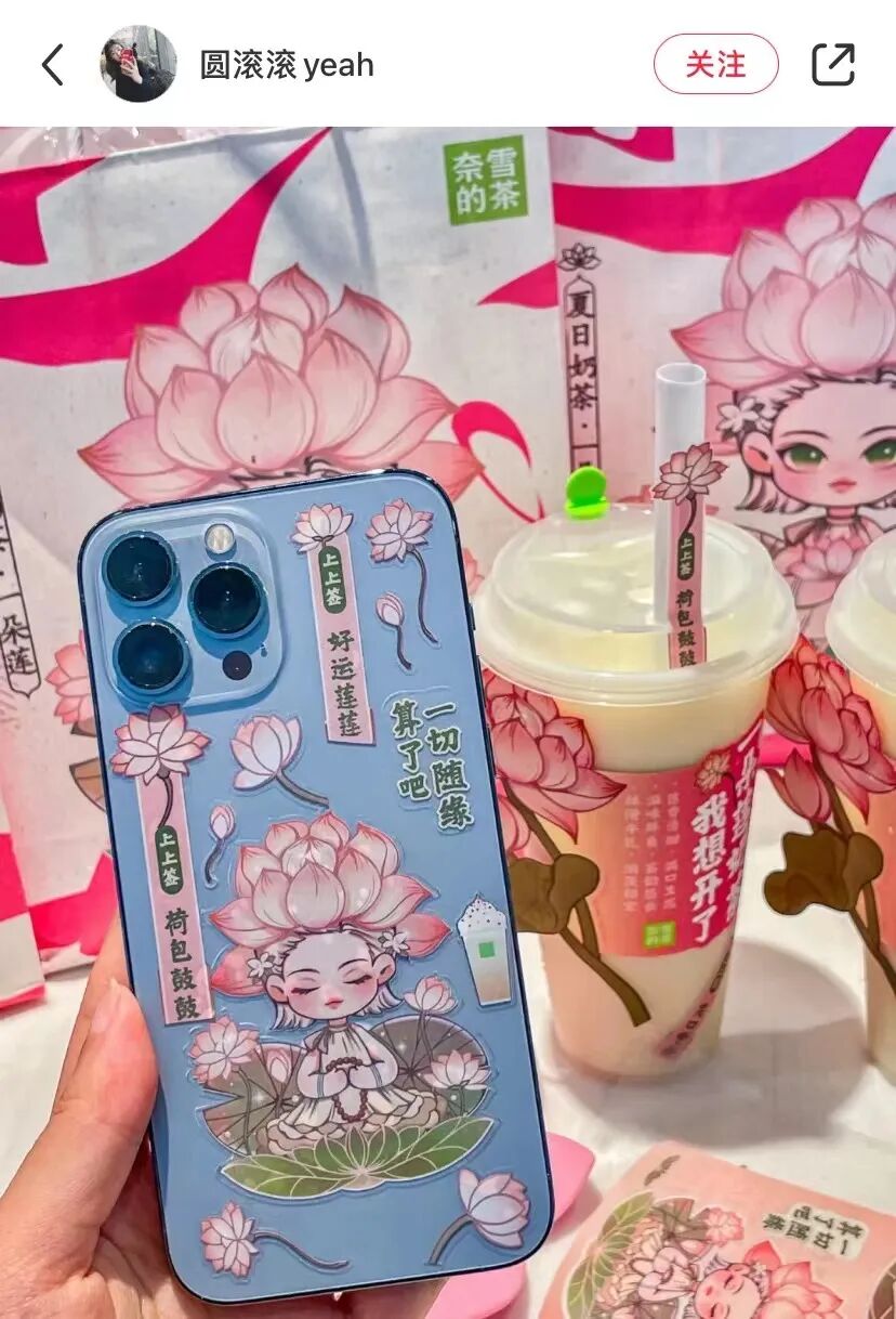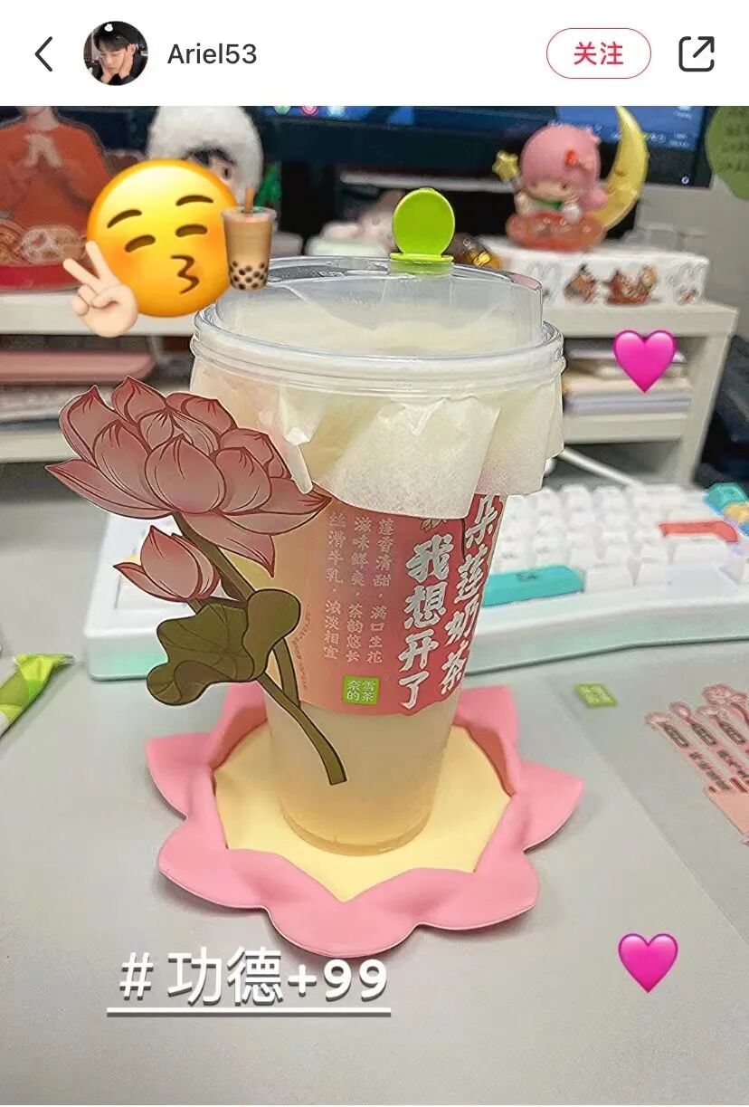 可见,莲花的独特意义在不同场景下展现了当代年轻人的两大追求——即“正向精神的鼓舞”和“不为世间烦恼困扰的平静”。据了解,这是奈雪新品的配套周边之一——莲花杯垫,已经成为了周边人气王。不少朋友甚至为了这个杯垫特意蹲点抢购,生怕被派完。此外,还有莲花手提袋、上上签贴纸、莲花杯贴等一系列莲花周边。可以看到,周边上还印制了与佛系相关的词条内容,例如纸袋上的“以荷为贵”、“大彻大悟”、“我想开了”、“问题不大”、“做人最要紧的是开心”……为年轻人提供了缓解焦虑的情绪价值。随后,精选君刷了刷小红书,看到了好多“想开了”的人:莲花周边被网友各种妙用了起来,但要说最贴合主题的,还得是下面这种:看完网友晒图,精选君默默打开了点单小程序,没想到奈雪还挺会来事的,直接注明了含有杯垫的套餐,快速指明了消费亮点。从“佛系青年”到如今大热的“寺庙经济”,不难发现当下年轻人在精神力量上的无穷信仰。而奈雪则抓住了这一人群洞察,并将其融入于产品,成功制造了一个情绪出口,一定程度上缓解了大家快节奏生活下的焦虑心境。