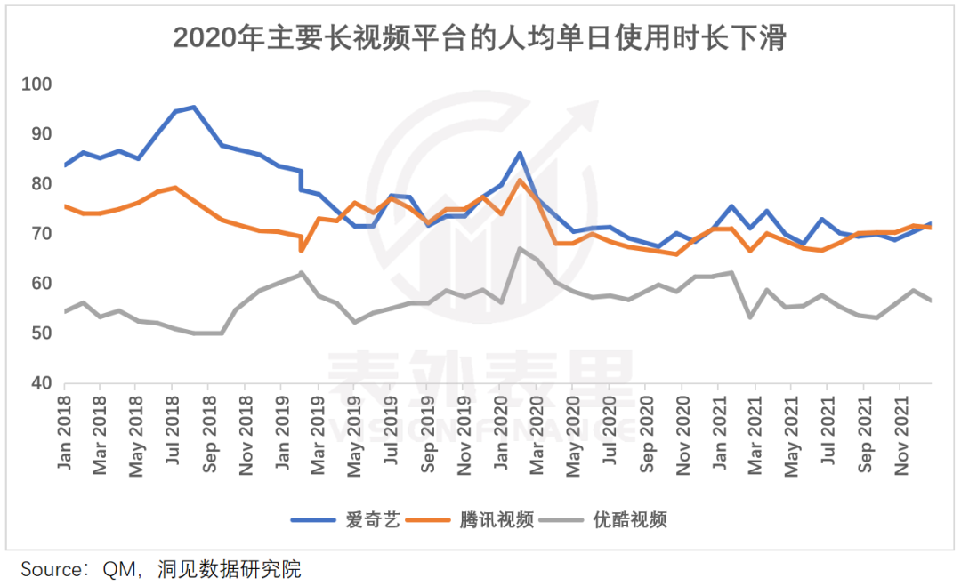 2020年疫情期间,大家有大把空闲时间消遣,但事实上,电视剧的消费情况却不如往年。如下图,优爱腾三家的平均日使用时长,出现不同程度的下滑。