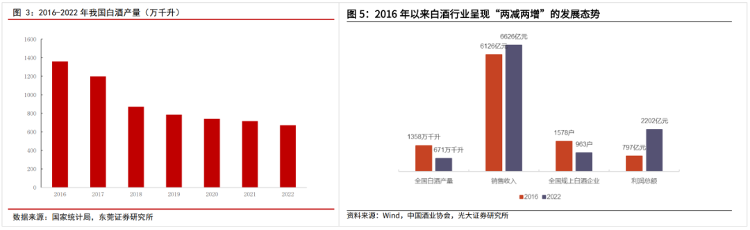 以白酒为例,近几年整体需求缩减——2022年相较2016年,产量减少一半,但销售收入是增长的。原因是消费升级带动中高端白酒的需求不断增长。