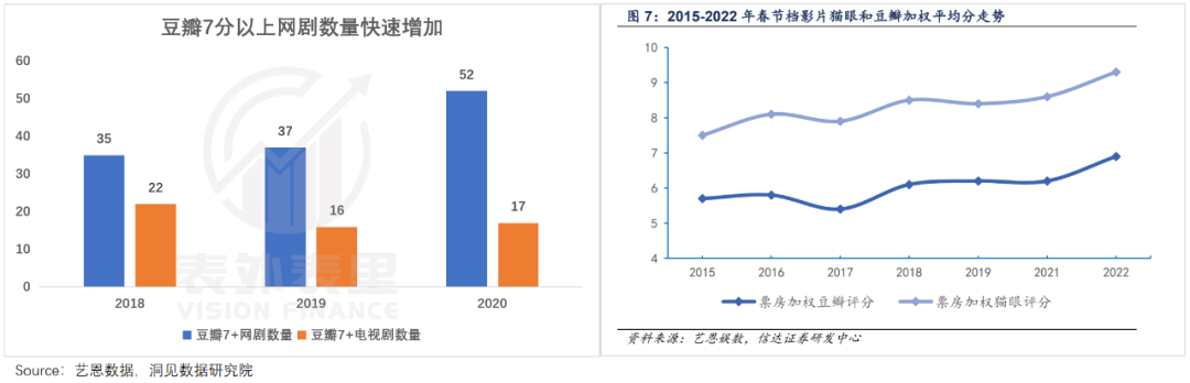 以2020年为例,豆瓣7分以上网剧数量达52部,同比提升41%。同时,电影的豆瓣加权平均分,也不断上升。