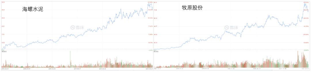 可以看到,海螺水泥2015年产能恢复阶段,股价涨幅为2倍多;而牧原股份在2018年的猪周期中,股价涨幅将近10倍。