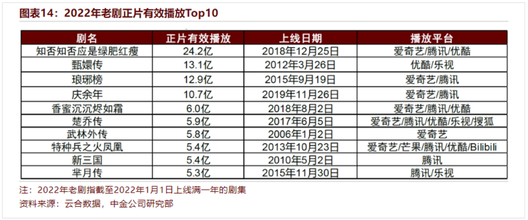 可以看到,口碑老剧被盘了又盘——2022年,全网剧集正片有效播放量同比下滑2%,而老剧有效播放量却逆势同比增长10%。