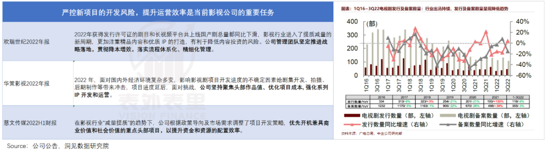 而欢瑞世纪、华策影视、慈文传媒等影视制作公司,也纷纷声明表示:严控新项目的开发风险,提升运营效率仍是当前的重要任务。