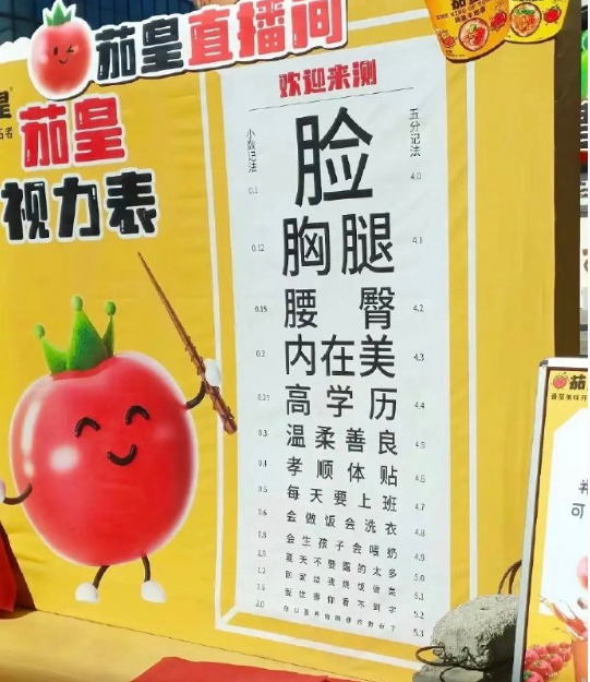 事情是这样的,统一茄皇在线下物料中使用了一张包含“胸”、“高学历”、“会生孩子会喂奶”等字样的视力表。