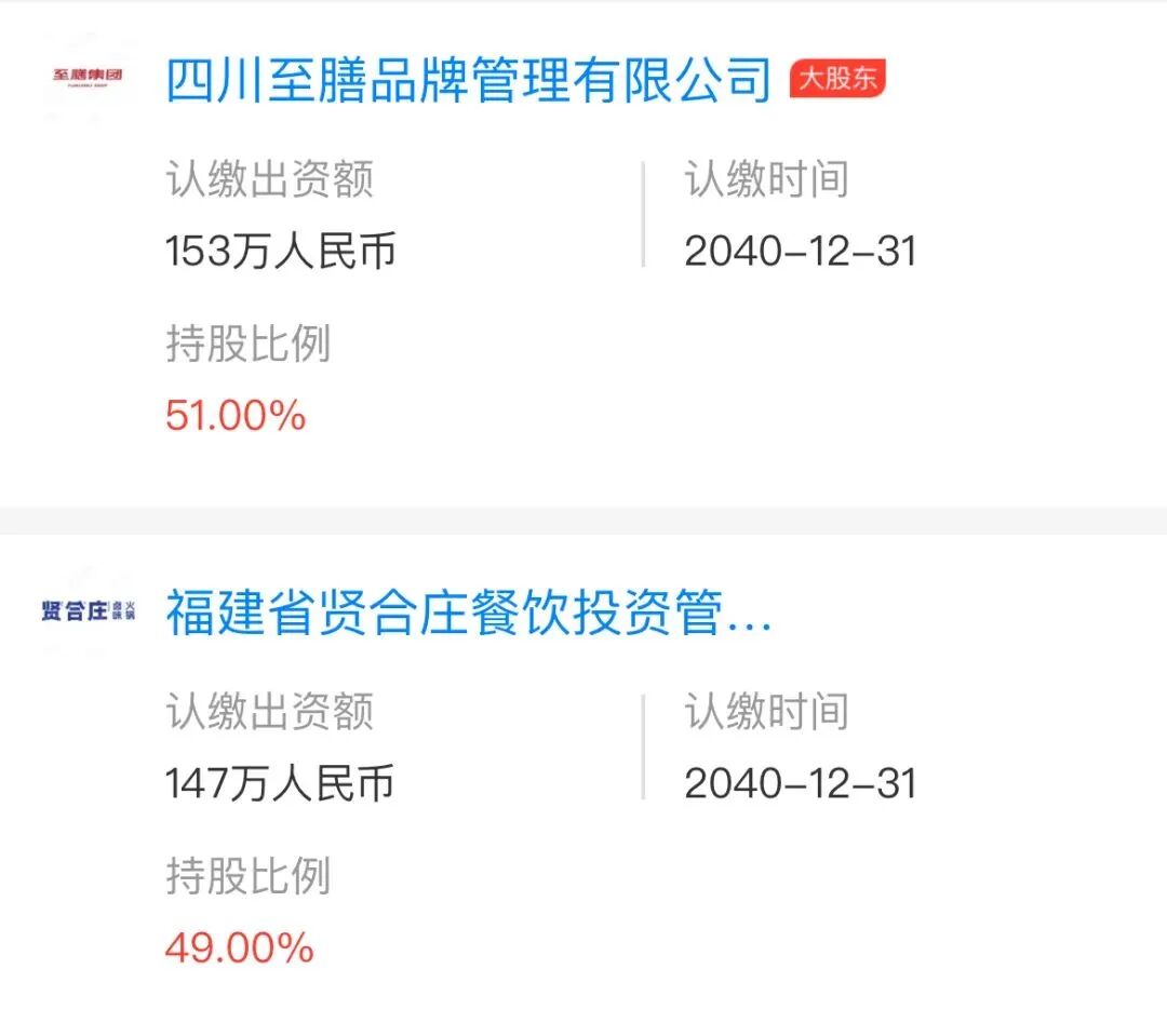 加盟一家贤合庄,需要缴纳48万元加盟费、5万元保证金等,除此之外,还要缴纳月营业额2%的管理费。而加盟商在交完加盟费后,使用品牌的年限只有3年,到期后加盟商还要以每年2万元的价格续约。