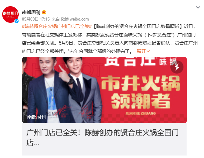 如今打开微博,输入“贤合庄”等关键词,出现的热门消息还停留在去年6月“陈赫退股贤合庄”、“加盟商集体维权”的旧闻。