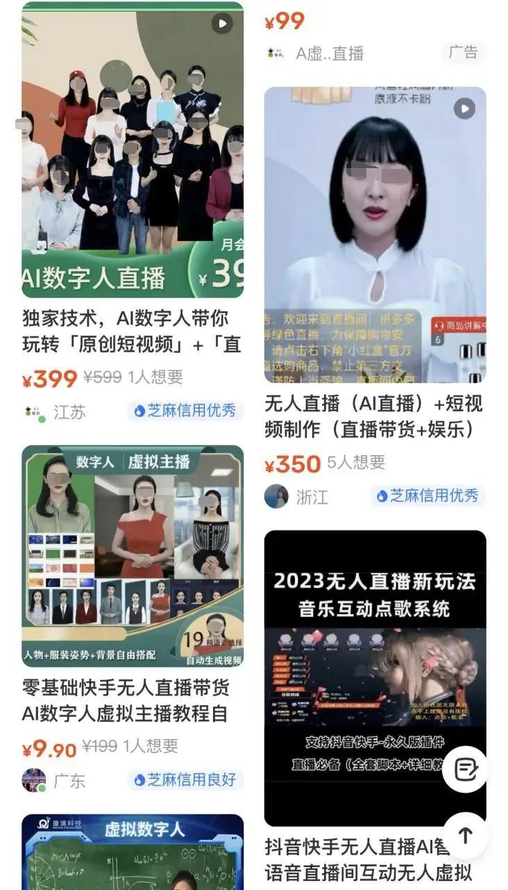 如今在抖音、淘宝和闲鱼等平台上直接搜索AI主播,可以看到不少提供相关服务的厂商。买家针对自己的产品和相关需求进行描述,对应服务商就能够通过各种软件帮助买家打造出AI主播。