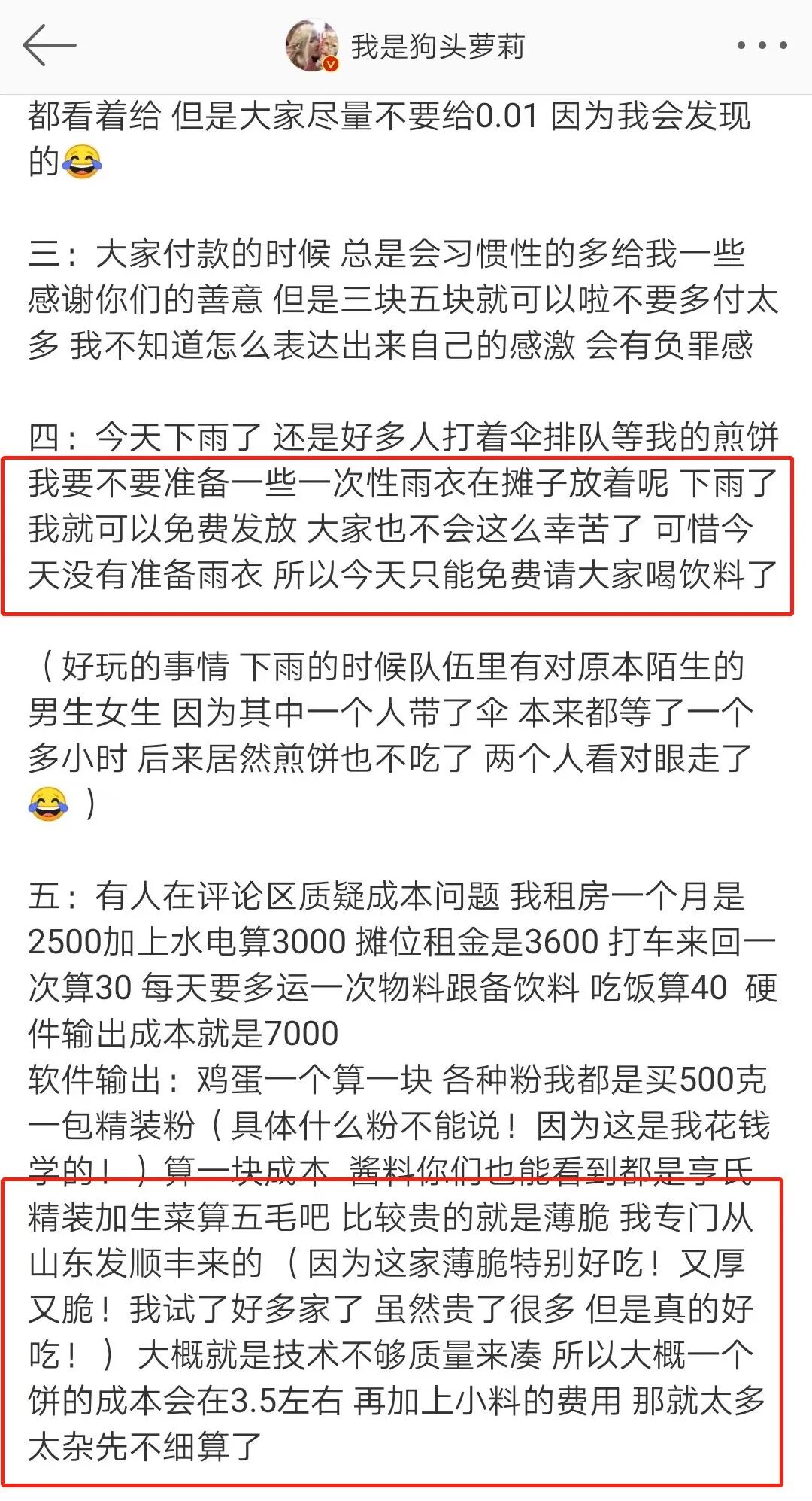 当晚收摊后,“狗头萝莉”在微博公布了自己的营业数据,站了6个小时,摊了100多张煎饼,收入1300多元,除去摊位费、房租、饼成本、配料成本、人工成本,她一共赚了400多元。