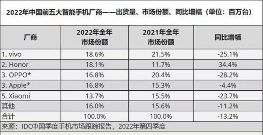 哲库的资金来源主要依赖OPPO输血,但在大环境恶劣的情况下,OPPO承受的财务压力也在增大。IDC数据显示,去年OPPO下滑幅度时前五位厂商里最大的,达到了27%。