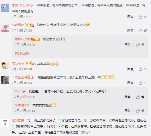 从想法提出,用了仅仅3天,就做到了第一批口罩下线,再一次刷新了“五菱速度”。将五菱车主们的漂移车速转化成了“五菱速度”。挺身而出制造口罩这一义举,被央视新闻点名表扬,获得了老百姓的认可和点赞;社交媒体上,网友给予了五菱品牌极大的关注热情。“中国汽车之光”、“下一辆车就买五菱”等对五菱品牌的信任······网友好感度up,社交口碑不断输出扩散。