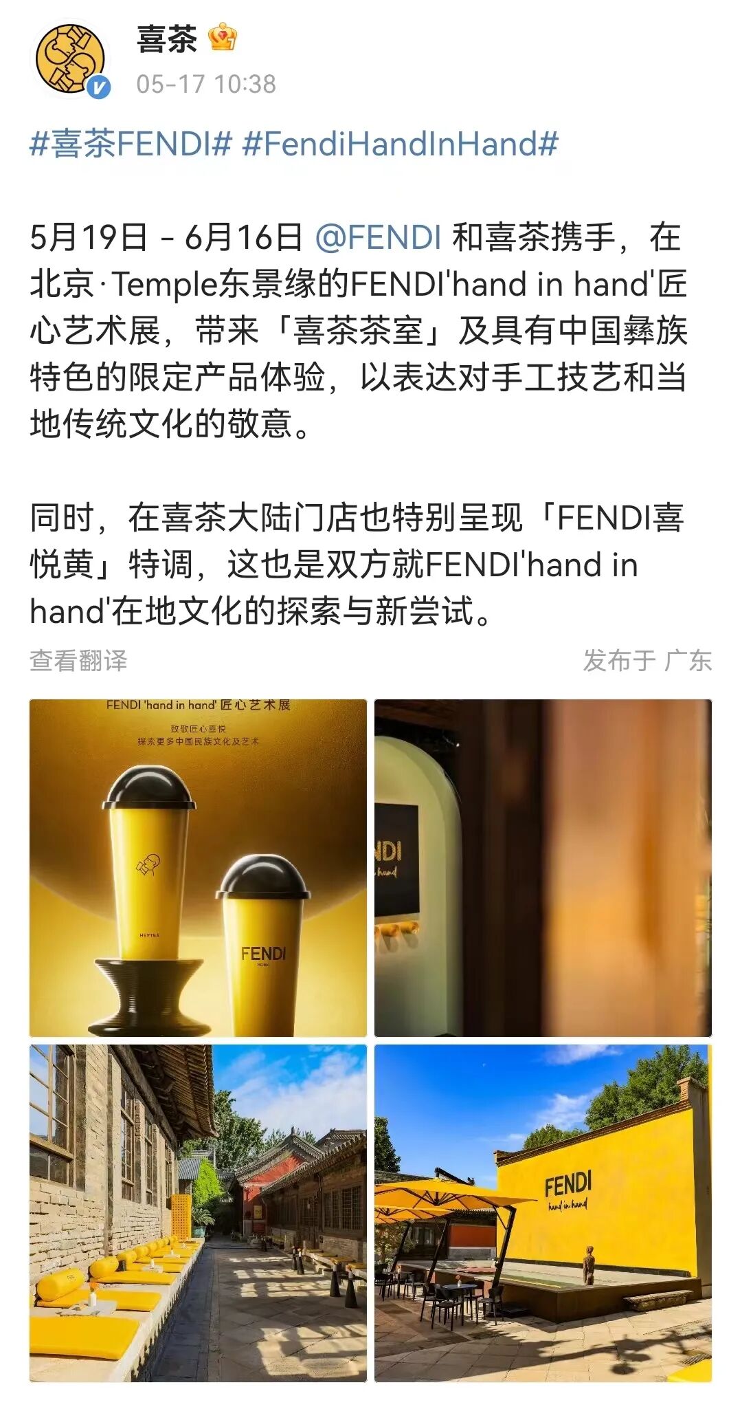 据喜茶官方推送,这一次的联名契机是FENDI在北京办了一个匠心艺术展「hand in hand」,顾名思义,主推的是中国和意大利手工匠人的文化碰撞与交流,“礼赞中意工艺与设计,传承近百年品牌历史”,而喜茶在其中提供了具有中式风格的茶室体验。