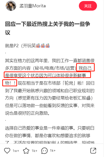 时至今日,孟羽童的置顶微博仍是其2021年入职格力的“感言”;置顶小红书还是“我就是那个被董明珠选中的22岁女孩”vlog。