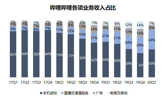 而作为平台方的B站,后续将通过收取服务费的方式,增加其广告业务的收入。据财报,2020年第一季度,B站广告收入同比增长90%至2.1亿元,规模尚小,对公司整体营收的贡献比例为9%(受疫情影响)。