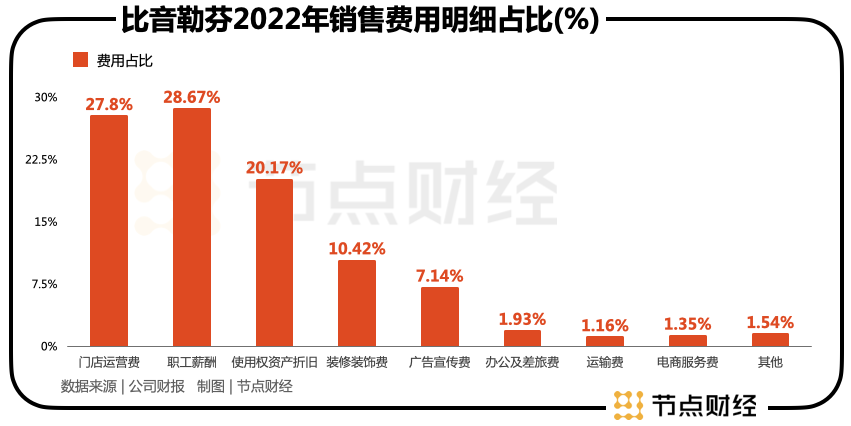 根据公司招股书及近期年报,在比音勒芬的销售费用中,“职工薪酬、门店运营费、使用权资产折旧、装修装饰费”四项的占比最高,合计占比接近九成。