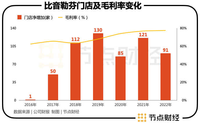 之所以能有这么好的业绩,离不开比音勒芬“高端”的售价以及稳定的门店扩张节奏。财报数据显示,上市以来,比音勒芬的门店数量以年均98家的速度净扩张,同时公司毛利率从62.3%稳步增加至77.4%,2021年,比音勒芬服饰的平均单价为高达739元/件。
