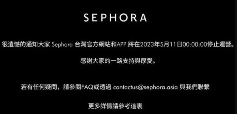 继退出俄罗斯市场后,近日,丝芙兰再度宣布,将于5月11日起停止对中国台湾地区官方网站及APP的运营,如果向前回溯,丝芙兰在全球的日子也并不好过。