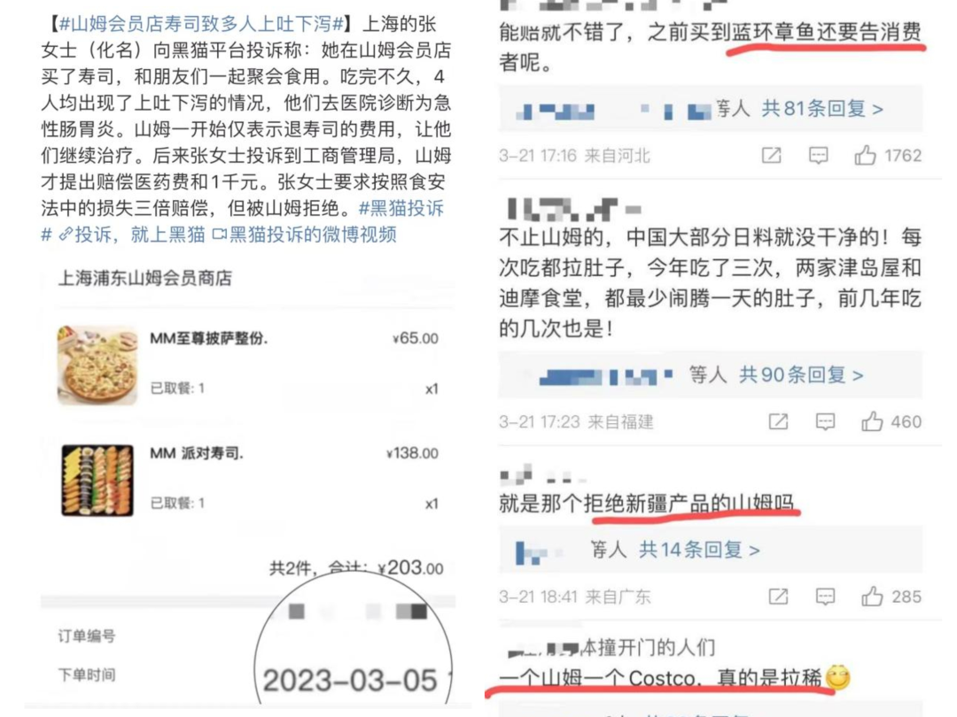 今年1月和3月,山姆会员店接连被爆出“蓝环章鱼事件”和“寿司食安问题”,直接上了微博热搜,而山姆方面撇清责任、冷漠回应之举更是让网友群情激愤。