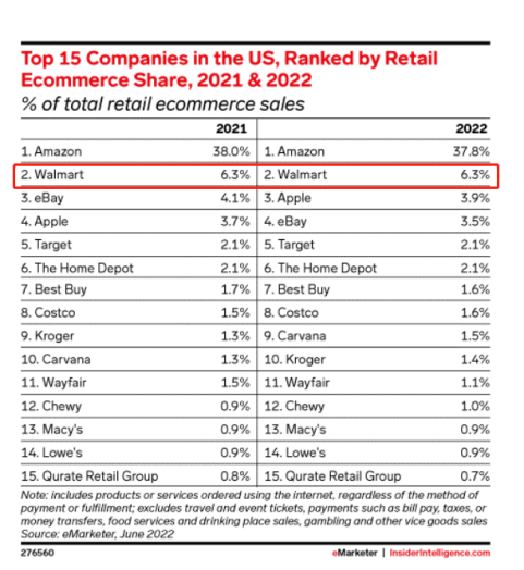 榜单显示,2022年亚马逊电商市场份额占比达37.8%,沃尔玛的份额较上一年并无进步,仍为6.3%。