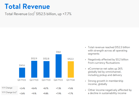 5月18日晚,沃尔玛(NYSE: WMT)披露最新财报,交出了其在2024财年Q1季度即2023年2月1日至4月30日报告期内的成绩单。