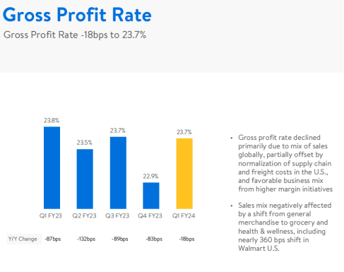 在本财季营收增幅不小的情况下,沃尔玛的盈利表现却在倒退。数据显示,2024财年Q1季度,沃尔玛的毛利率为23.7%,同比下降1个百分点。